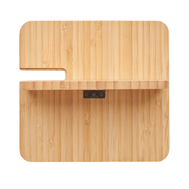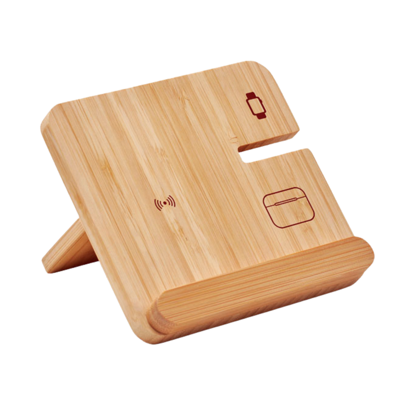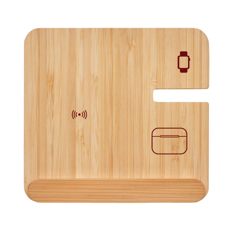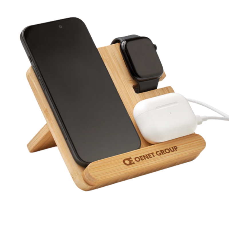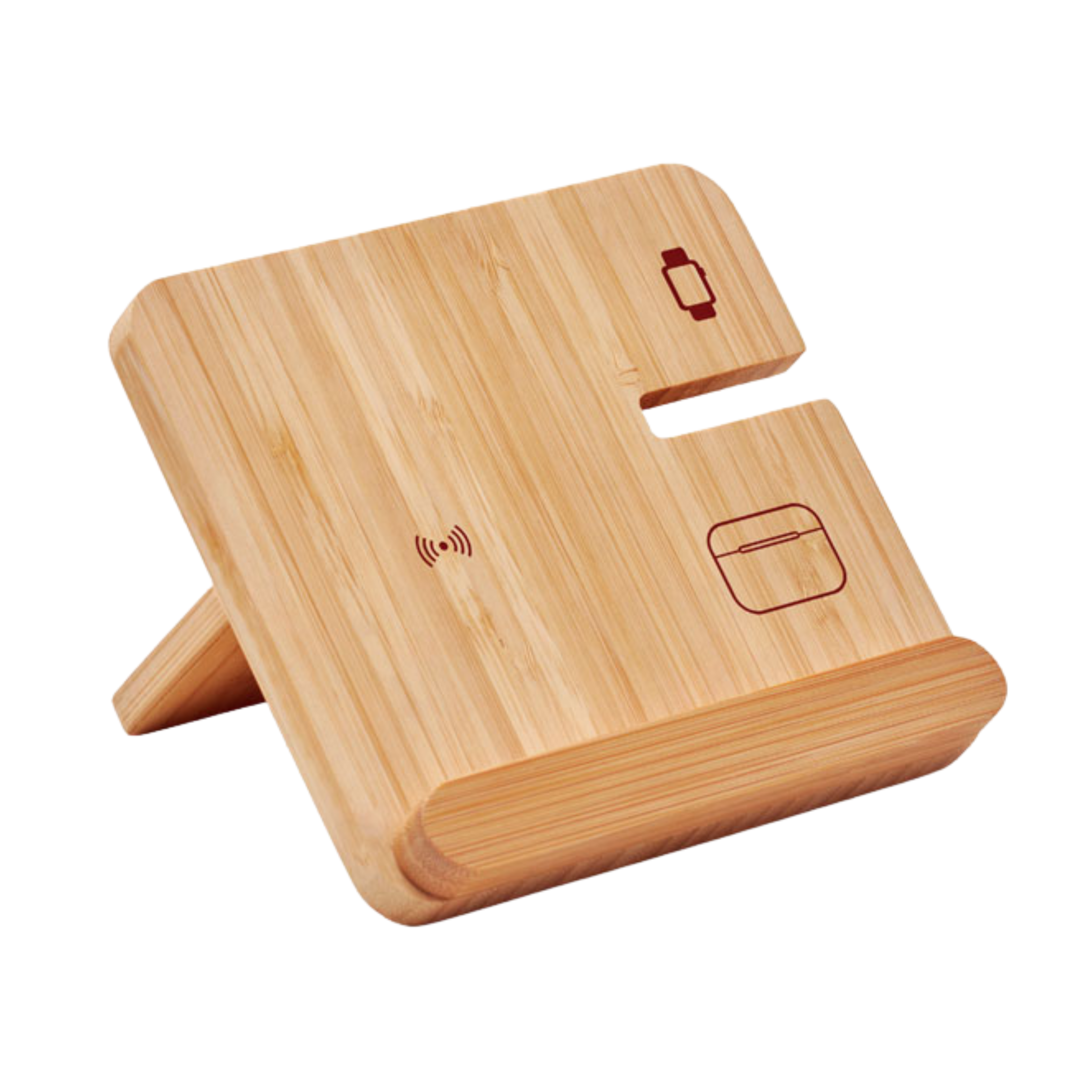 This eco-friendly 3-in-1 foldable charging station combines functionality with sustainability. Encased in bamboo, it features a dual coil 15W wireless charger, a dedicated Apple® smartwatch charger, and a TWS charger. Its sleek design also includes a convenient phone stand, making it a versatile addition to any workspace.