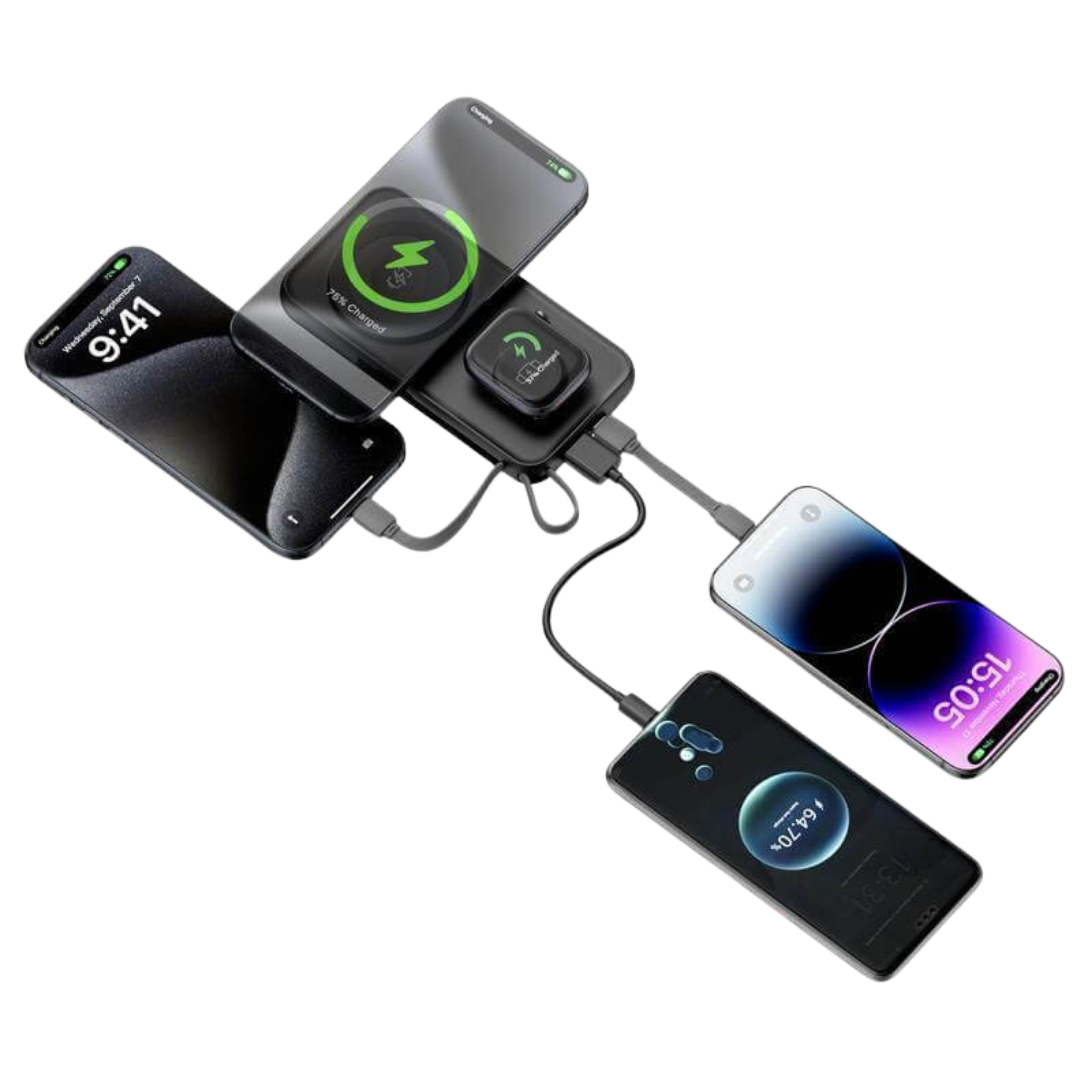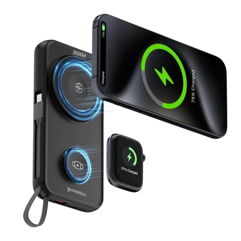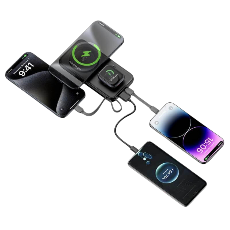 * Built-in cables for easy device charging, plus wireless charging